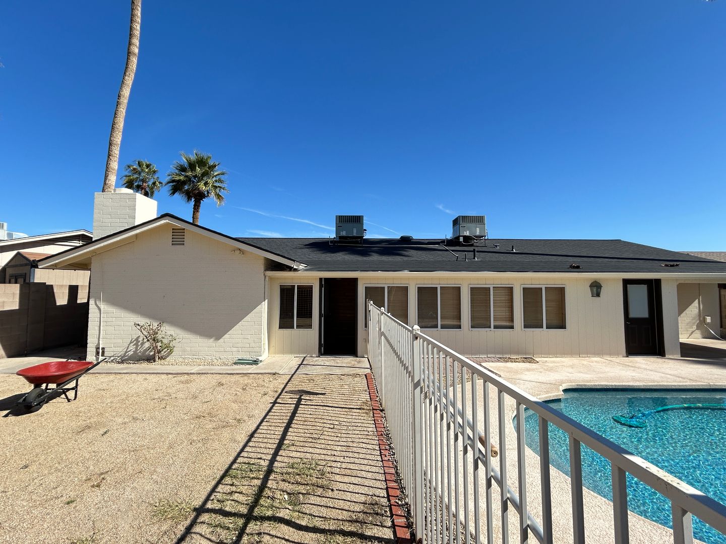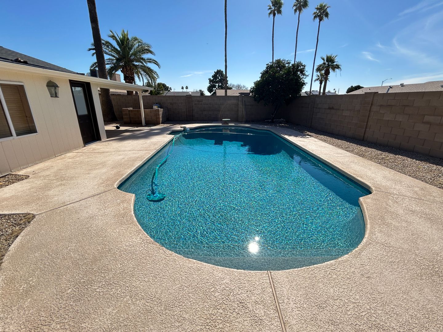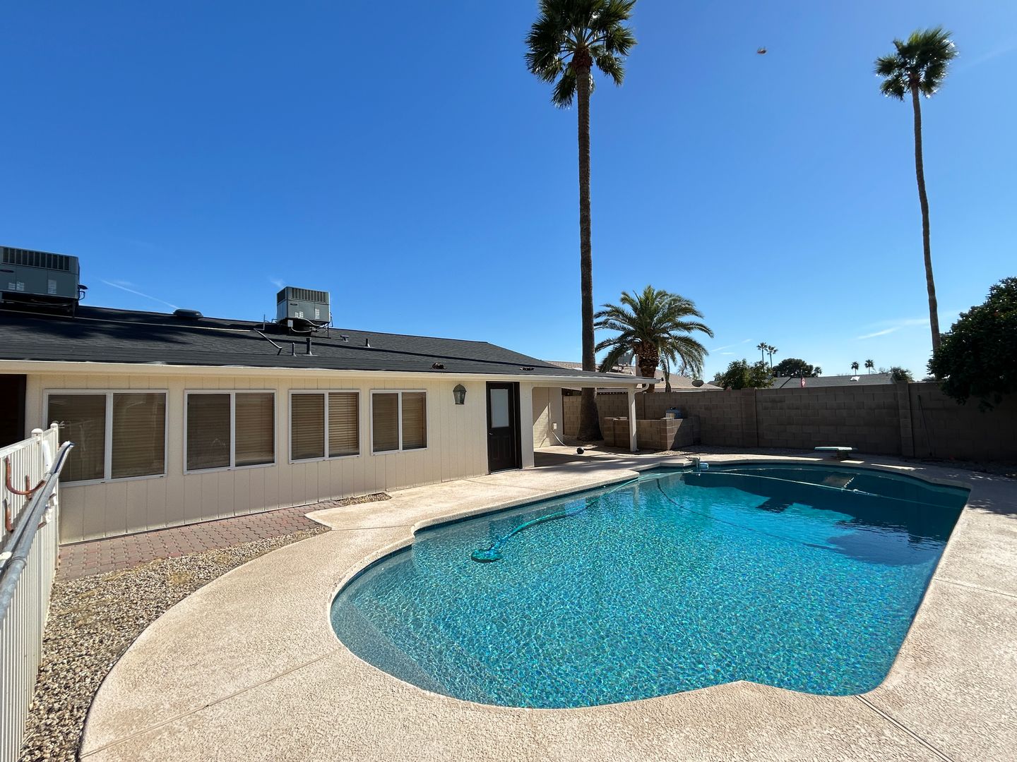 $500 Move in discount off first months rent for quick move in! Stunning 3 bedroom, 2 bathroom, 2 car garage with a private pool, pool service provided. The family room features a cozy fireplace, and an Arizona Room for extra space for entertaining. The Master Bedroom features 2 walk in closets with access to the pool. And no HOA! This home is a perfect blend of comfort, convenience, and style.